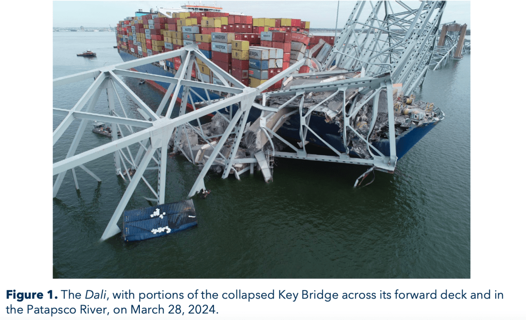 On March 26, 2024, about 0129 eastern daylight time, the 984-foot-long Singapore-flagged cargo vessel (containership) Dali was transiting out of Baltimore Harbor in Baltimore, Maryland, when it experienced a loss of electrical power and propulsion and struck Pier 17, the southern pier that supported the central span of the continuous through-truss of the Francis Scott Key Bridge. A portion of the bridge subsequently collapsed into the river, and portions of the pier, deck, and truss spans collapsed onto the vessel’s forward deck (see figure 1). . .