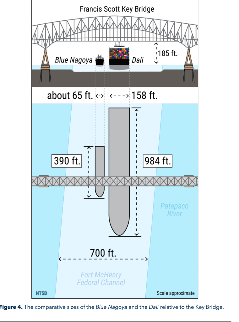 . . . The Key Bridge’s pier protection was struck in 1980 when the 390-foot-long Japan-flagged containership Blue Nagoya, which had a displacement or weight about one-tenth that of the Dali, collided with Pier 17 following a loss of steering about 600 yards from the bridge; see figure 4 for a size comparison of the Blue Nagoya to the Dali. . .