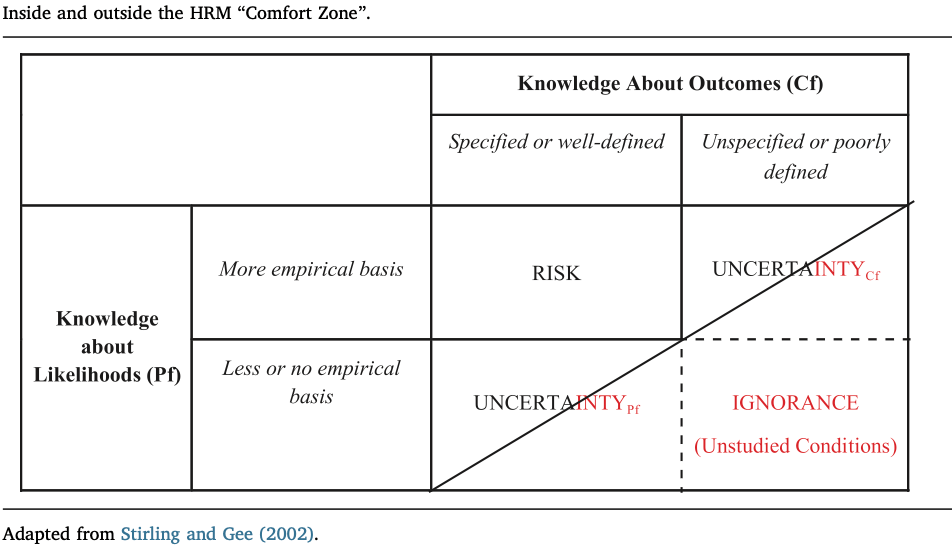 High reliability management professionals we study practice vigilance to stay out of the red area below the diagonal and stay within the area above it—a stylized version of their comfort zone. To maintain this level of comfort they tolerate some uncertainty about outcomes (Cf) matched by having high confidence in some probabilities (Pf). They also tolerate some uncertainty about probabilities by having higher confidence that consequences are limited. Management within these uncertainties is in either case supported by team situation awareness in the control room. In other words, the professionals seek to avoid unknown unknowns by extending but limiting their management to known unknowns—uncertainties with respect to outcomes and probabilities they can tolerate as part of their comfort zone as managers of operational risks and safety (Roe and Schulman 2018).