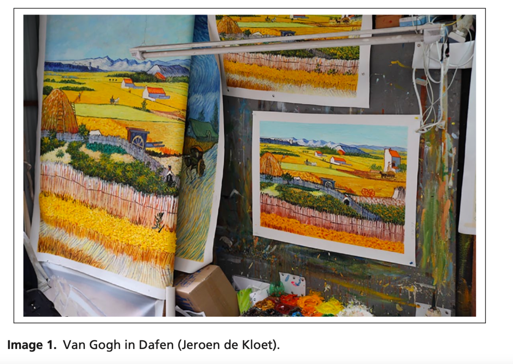 But when. . .researching shanzhai art made in Dafen village, located in Shenzhen, Southern China, and home to hundreds of painter-workers who make reproductions in every thinkable style and period, I was struck by the diversity of the artworks and their makers. The cheerfulness with which artworks were altered was liberating, for example, the ‘real’ van Gogh was considered too gloomy by customers, so the painters made a brighter version (see Image 1).